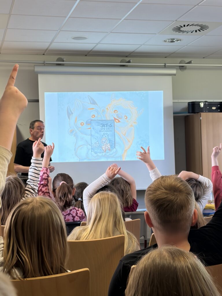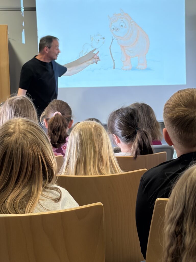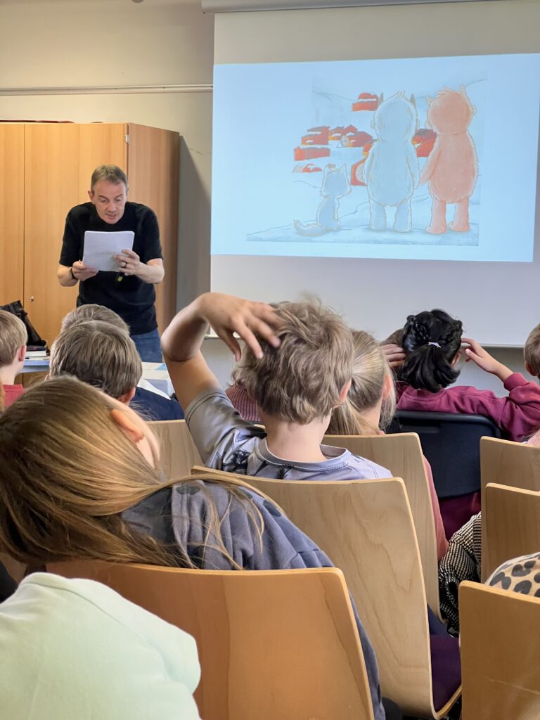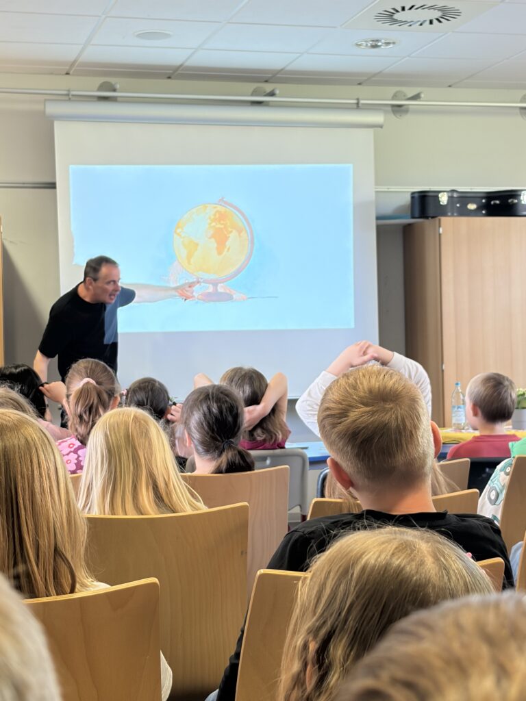 Ein regelmäßiges Highlight an diesem Tag ist der Besuch eines Autors oder einer Autorin. Diesmal besuchte uns Autor Stefan Gemmel, der unsere Schülerinnen und Schüler schnell in seinen Bann zog. Mit viel Ausdruck, Humor und schauspielerischem Talent las er den Jahrgängen 1 und 2 aus seinem Buch „Die Yetis sind los!“ vor und bezog die Kinder dabei aktiv mit ein. Es wurde viel gelacht, gestaunt und mitgemacht. Auch die Kinder der Jahrgänge 3 und 4 erlebten eine mitreißende Vorstellung seines Buches „Im Zeichen der Zauberkugel – Das Abenteuer beginnt“ . Stefan Gemmels Vortrag und Lesung stieß auch hier auf große Begeisterung und weckte die Lust auf Bücher.