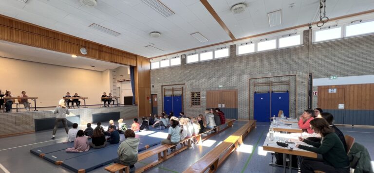 Ein weiterer zentraler Bestandteil des Tages war der Lesewettbewerb, der für jeden Jahrgang in der Turnhalle stattfand. Für die teilnehmenden Vorleserinnen und Vorleser war dies eine besonders aufregende Situation, in der sie ihr Können vor Publikum präsentieren konnten. Gleichzeitig stand die Jury vor der nicht einfachen Aufgabe, aus den vielen gelungenen Beiträgen die besten auszuwählen.
